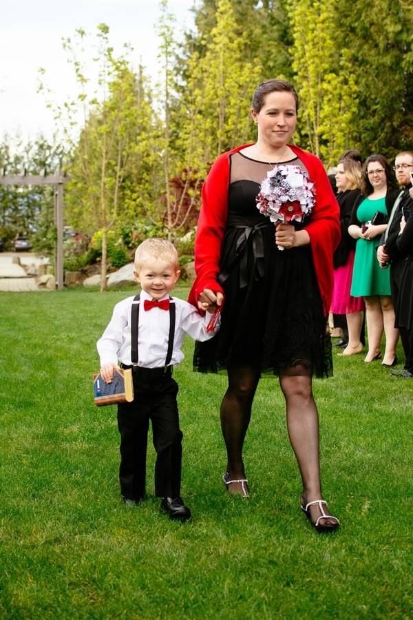 The groom and groomsman had a sleek, simple look. With the only wedding colour(red) showing up in the grooms boutonniere and handkerchief. The bridesmaids had a vintage inspired black dress. And I let them do whatever they wanted with their hair. And whatever shoes they wanted to wear. My dress was a vintage inspired Stella York. I love knee high socks, so I wore rainbow striped knee high socks and a wedge heel converse. That’s right, I wore converse shoes. And I was comfy!